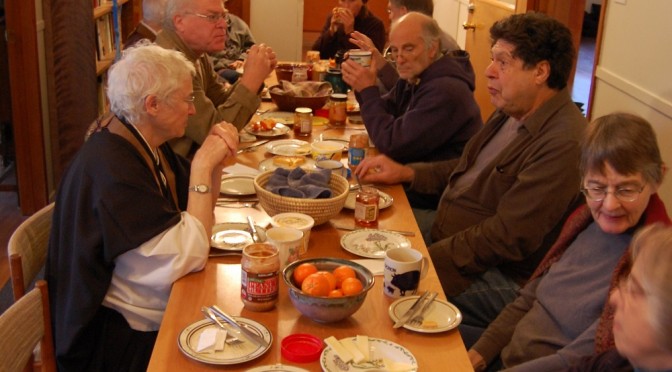 The early Sunday morning service is beautiful; lots of bells and bows and readings. It is my favorite time at Stone Creek. After the service, we eat breakfast together. It is a time when I can talk about hiking places and movies with Joko. I get to see Jisho relaxing, hear stories from Burt and puns from Eric. If you have never gotten up early enough to make it, try to come just to feel the interactive richness. Even the clean-up time after breakfast oozes camaraderie.