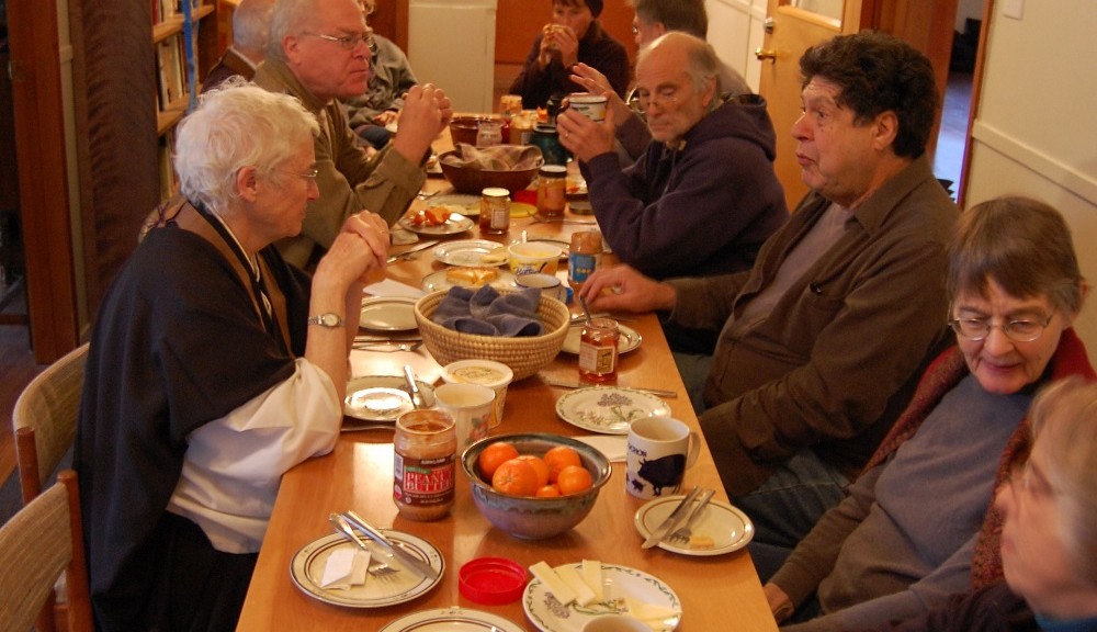The early Sunday morning service is beautiful; lots of bells and bows and readings. It is my favorite time at Stone Creek. After the service, we eat breakfast together. It is a time when I can talk about hiking places and movies with Joko. I get to see Jisho relaxing, hear stories from Burt and puns from Eric. If you have never gotten up early enough to make it, try to come just to feel the interactive richness. Even the clean-up time after breakfast oozes camaraderie.